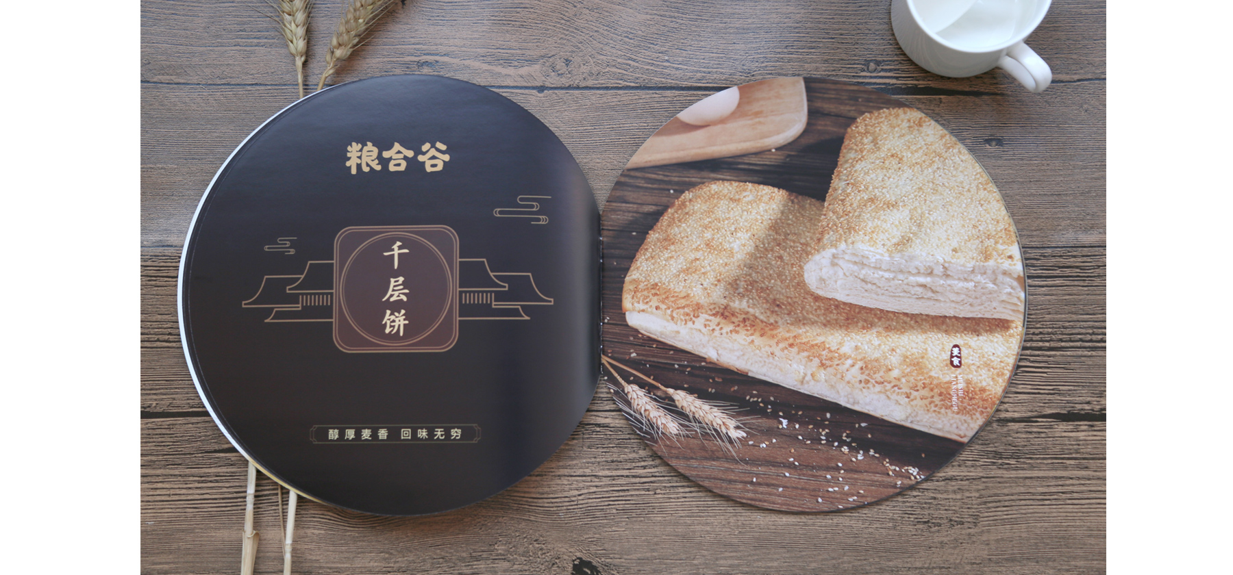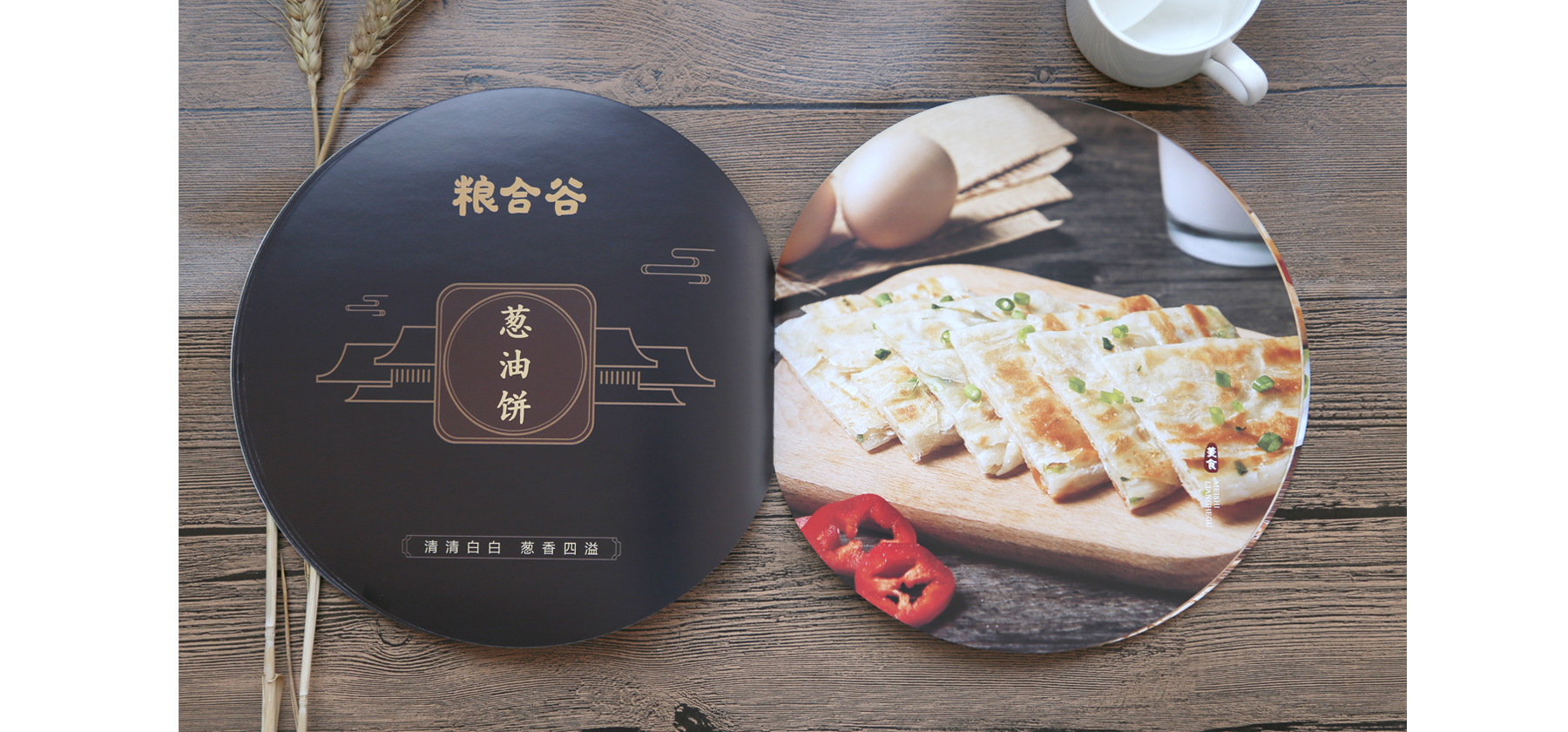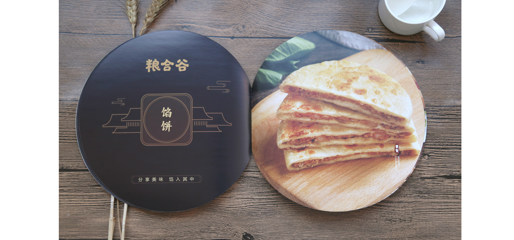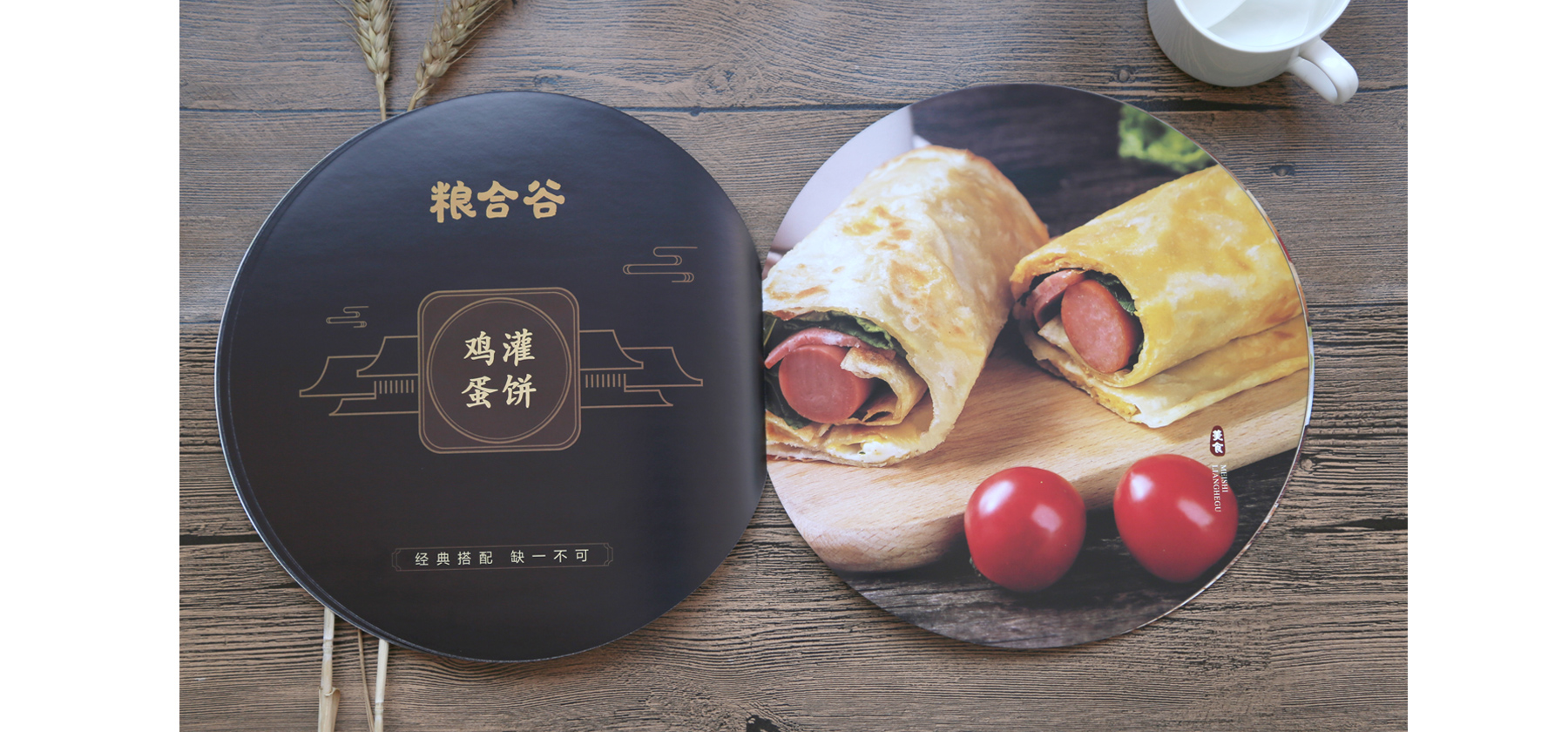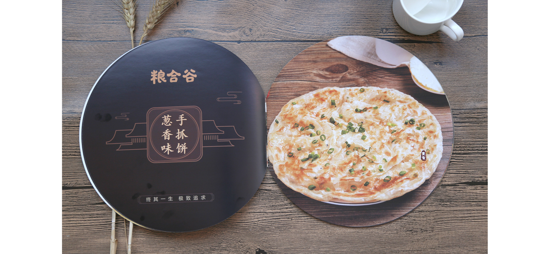 考慮到客戶的產(chǎn)品以手抓餅為主,封面采用的是一張手抓餅放在一個托盤上,拍攝封面的過程也是十分的曲折,因為角度是自上而下正對,需要攝影師趴在桌子上向下直著拍。